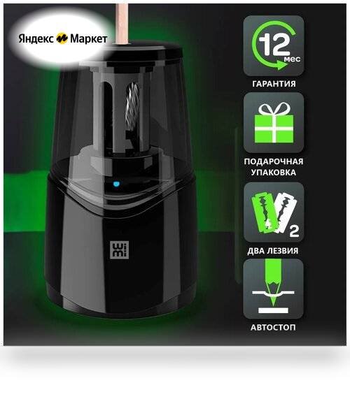 Не лишним будет иметь электроточилку в офисе для быстрой заточки пластиковых и деревянных карандашей. Благодаря силиконовым накладкам на корпусе настольная точилка не скользит во время работы. Качественное металлическое лезвие с лазерной заточкой легко справляется с разной толщиной карандашей. В комплекте входит дополнительное лезвие. Гарантия остроты одного лезвия до 12 месяцев, после чего его можно заменить.