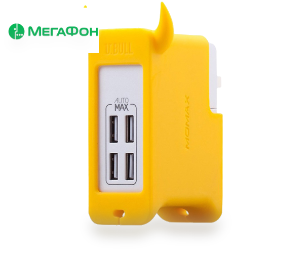 Зарядное устройство сетевое Momax U.Bull 4 USB 5А (желтый) продается в интернет-магазине МегаФон