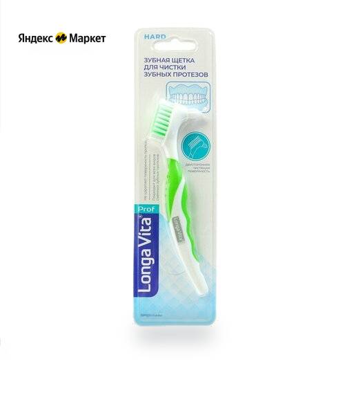 Способ применения: двусторонняя щетка Лонга Вита с жесткой щетиной Nylon Tynex обеспечивает необходимый уход за зубными протезами. Одна часть щетки предназначена для очищения внешней стороны протезов, вторая, компактная щеточка - для упрощенной чистки в труднодоступных местах и с внутренней стороны